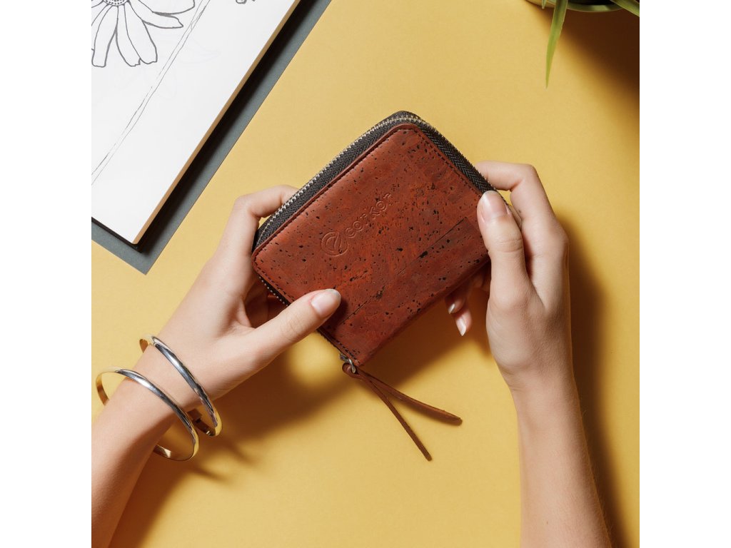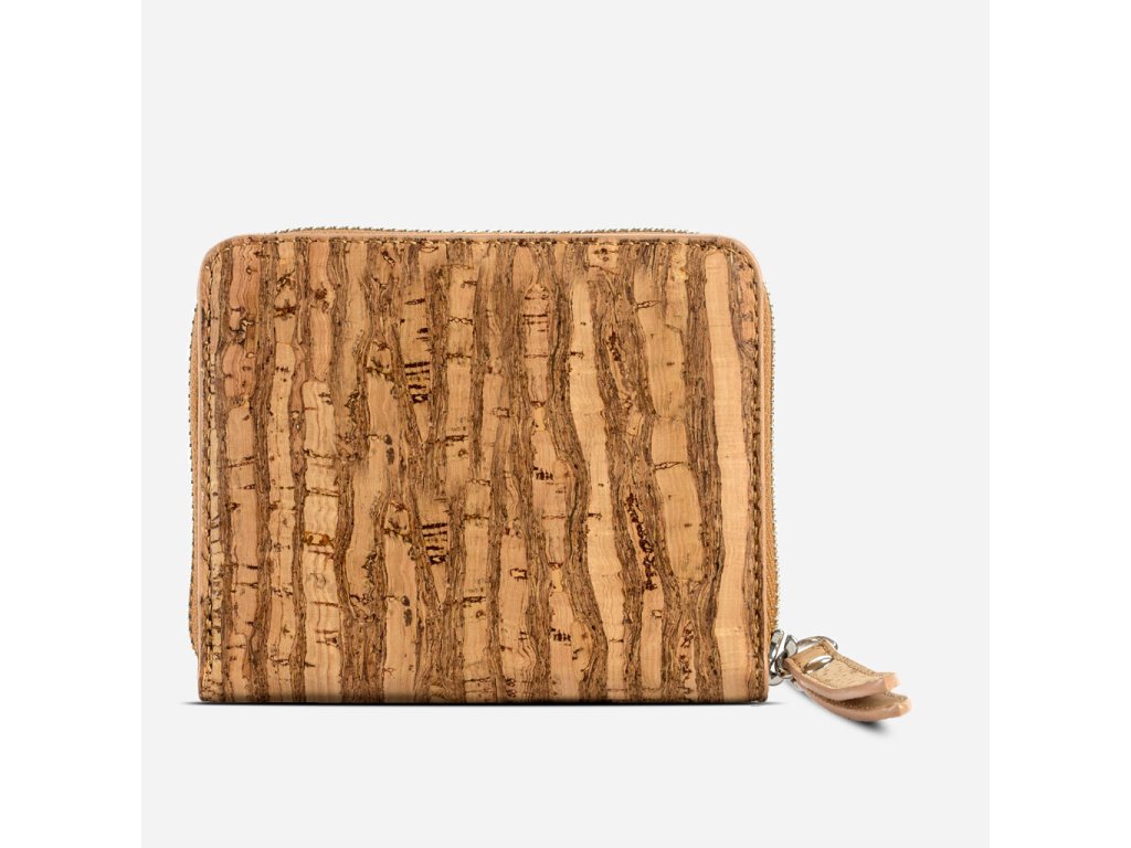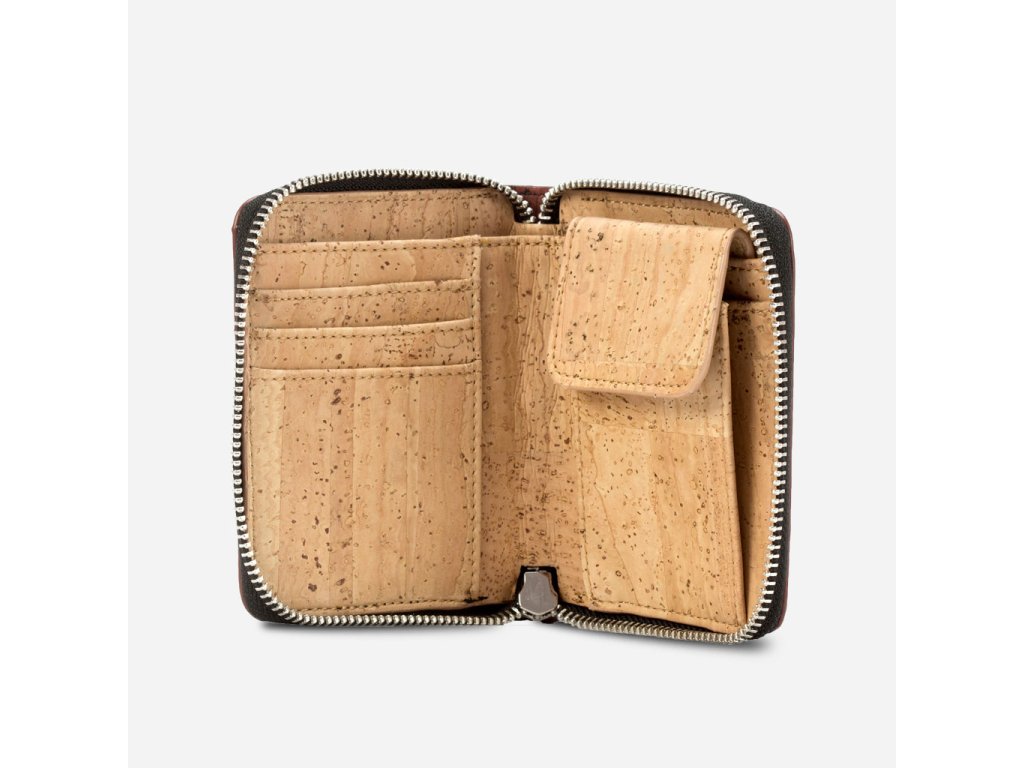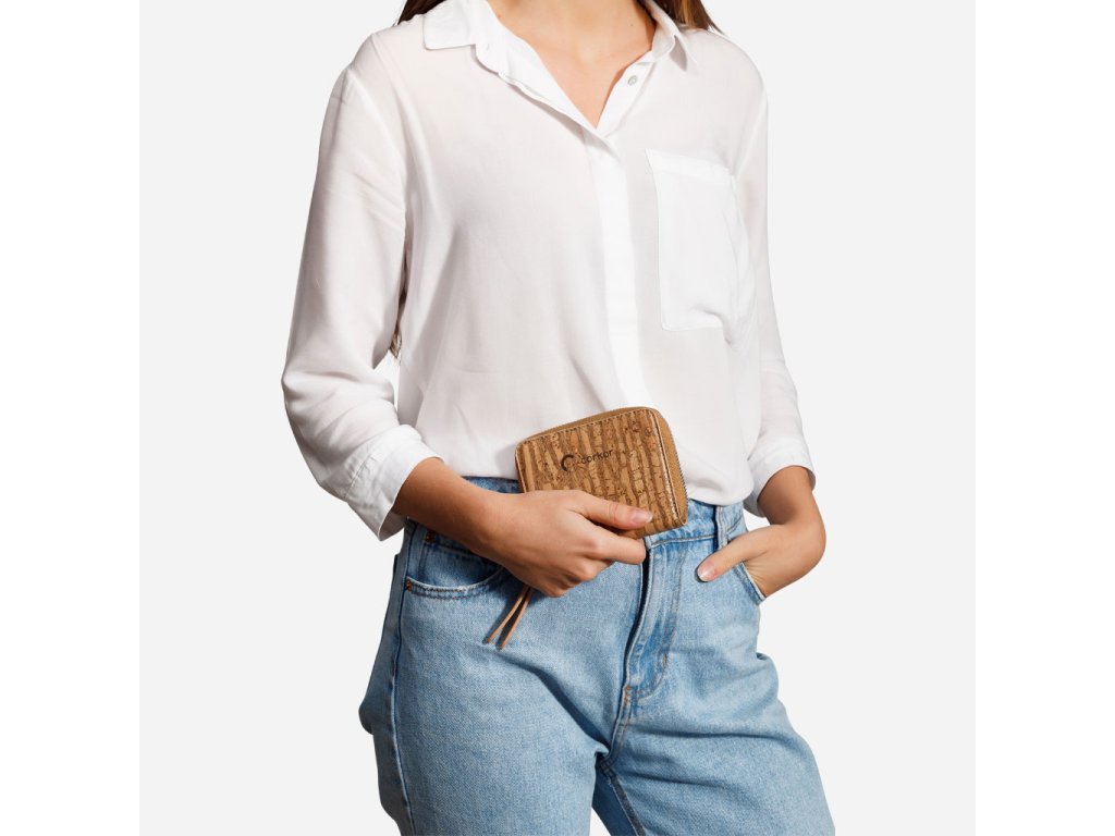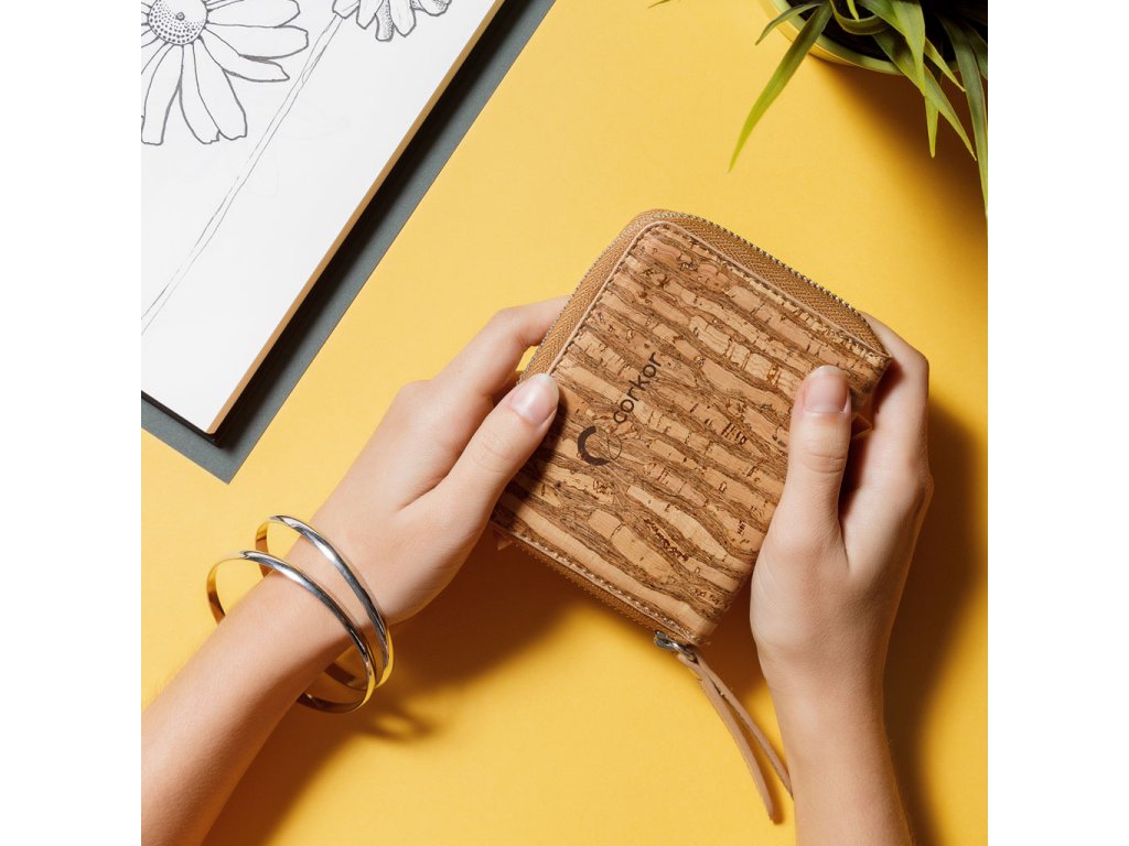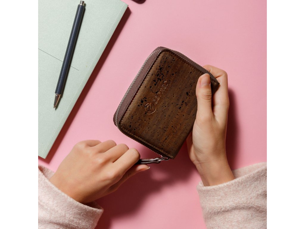Malá korková peněženka z pravého korku zaujme rozepínáním na zip po celém obvodu a promyšleně uspořádaným vnitřkem. Přestože je kompaktní, tato veganská peněženka pojme vše potřebné – karty, bankovky i drobné – a lehce se vejde do každodenní kabelky.